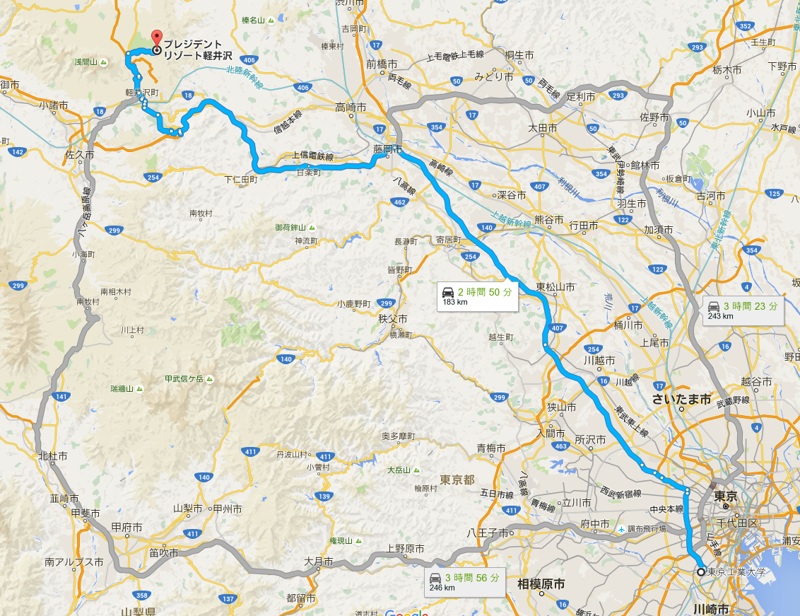 道路も東京を抜けてからはとてもすいていたので大学からは3時間程と思っていたより早く着くことができました.5時頃に出発して途中で休憩をはさみ8時着.軽井沢は5m先も見えない程濃い霧が発生していてかなりスリリングなドライブでした......