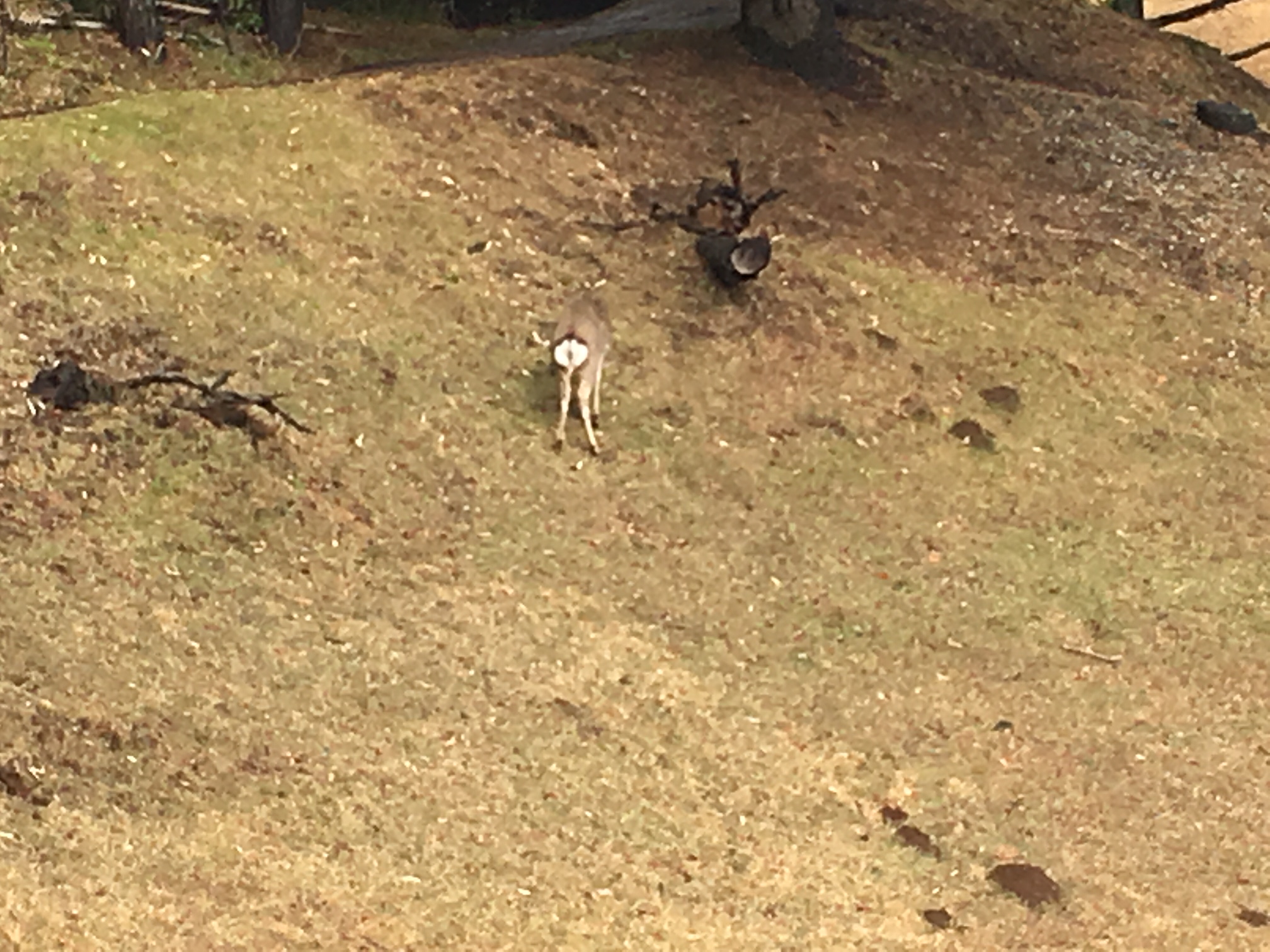 (写真は晴れたあとのショートホール(左)と鹿(右),人慣れしてるようでこの後自動カートに乗って50cm程の近さにまで寄ることが出来ました)
